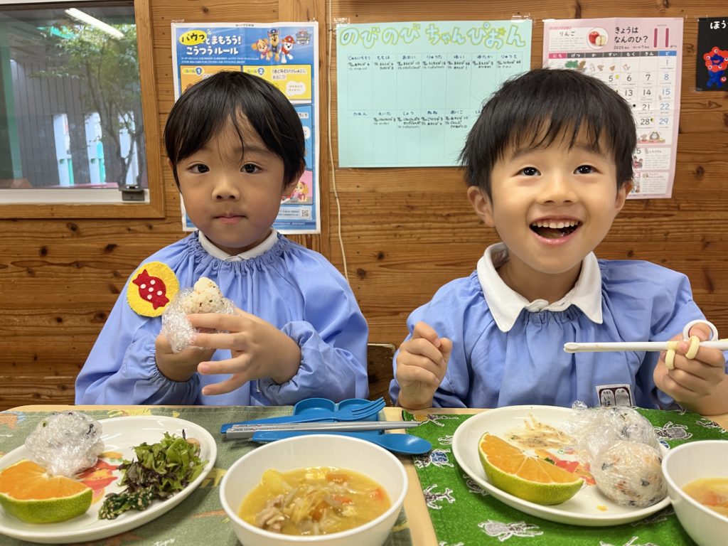 シトシトと冷たい雨が降る今日でしたが、幼稚園ではあったかい豚汁をみんなで作って食べました。こども達は具材を切ったり、おにぎりを握ったりたくさんお手伝いしてくれました。