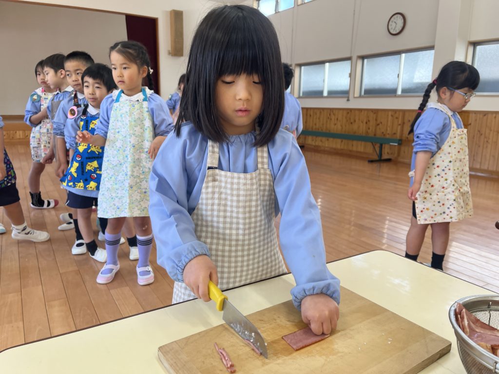 きい組さんははじめの包丁での作業で緊張している様子でしたが、先生たちに丁寧に教えてもらって作業をやり遂げていました。